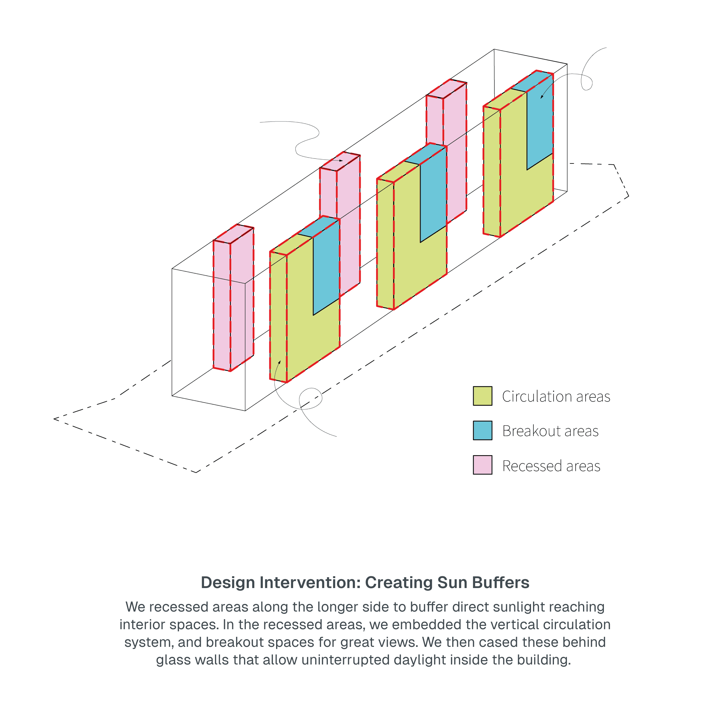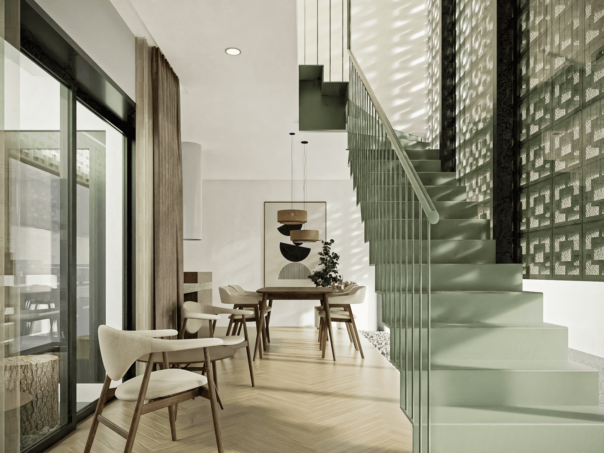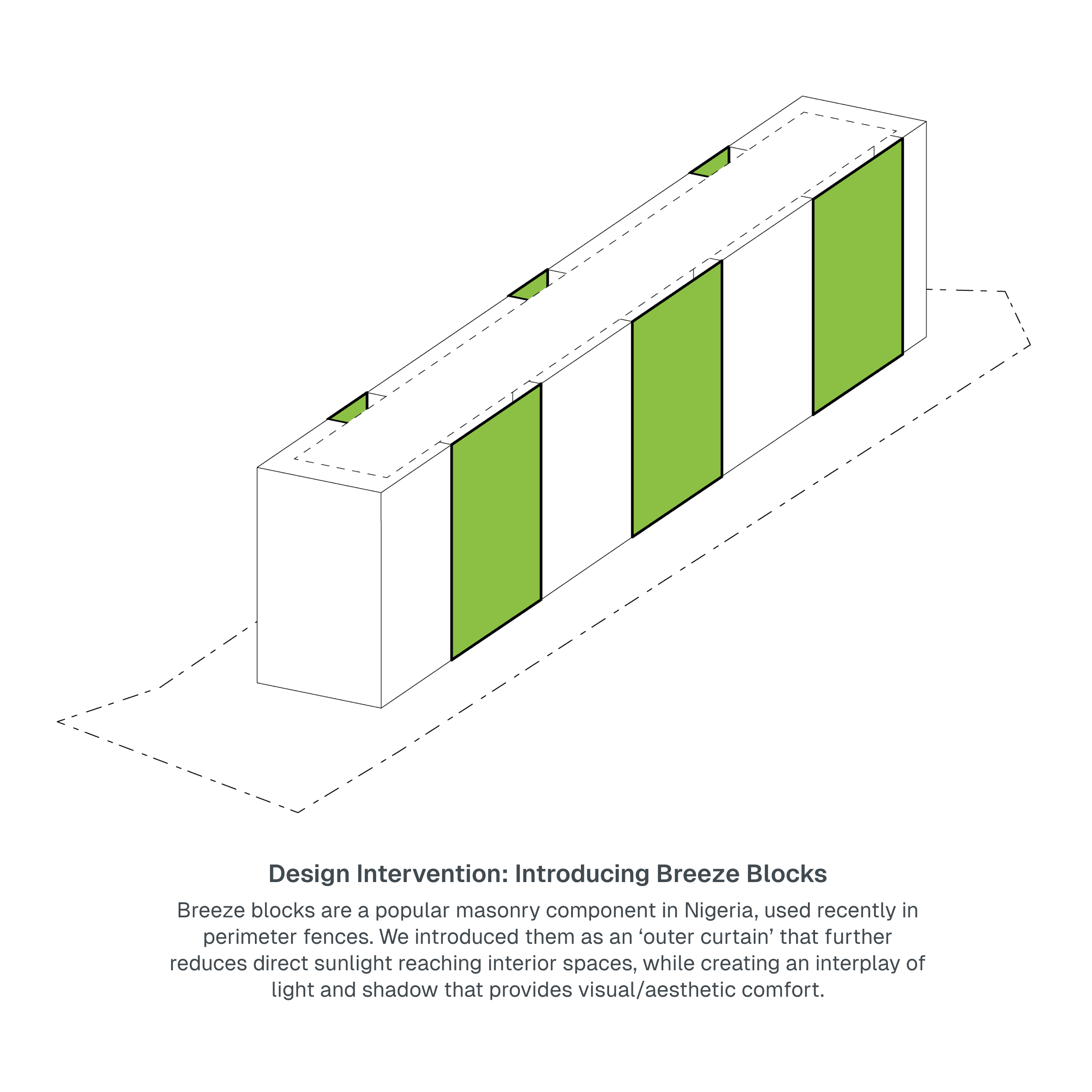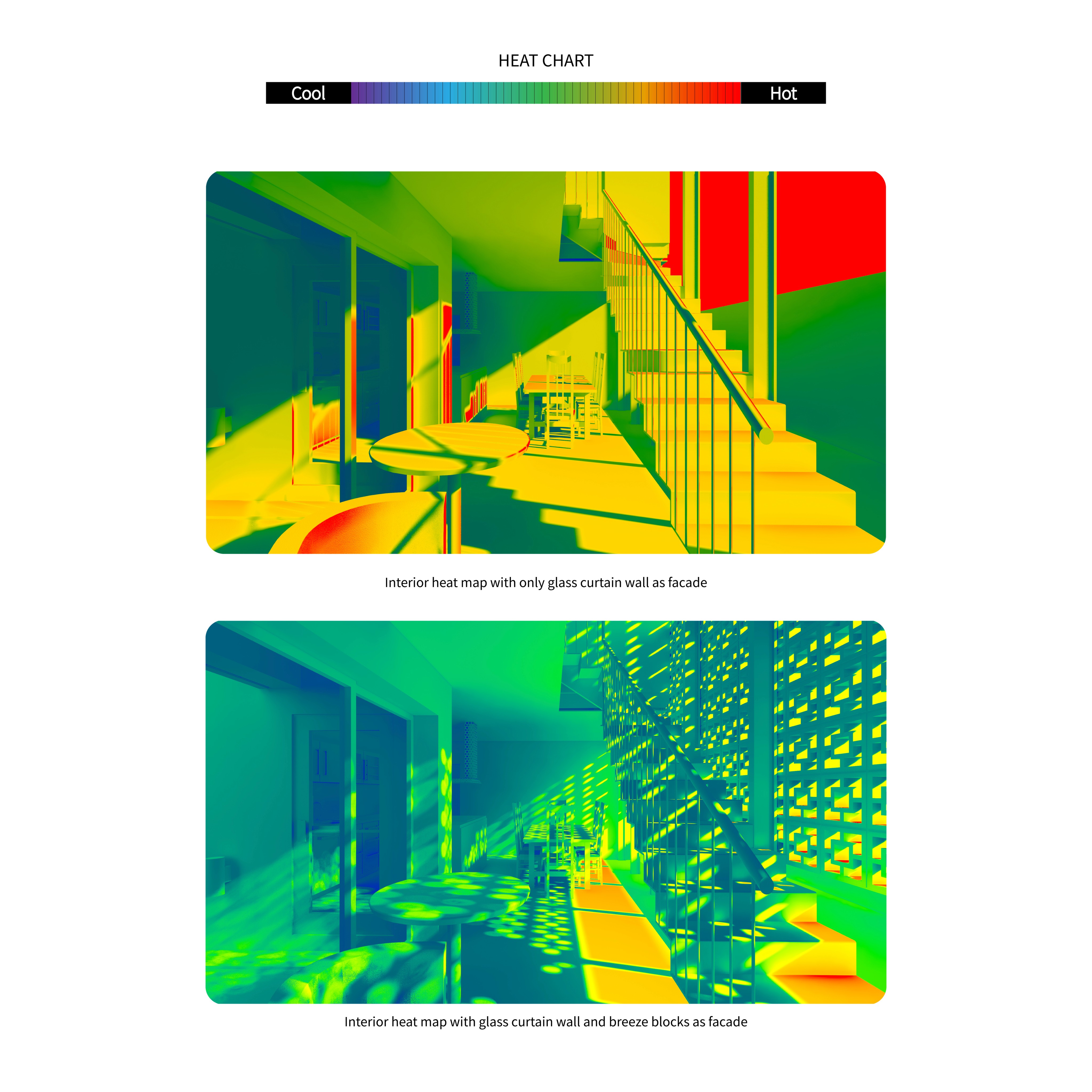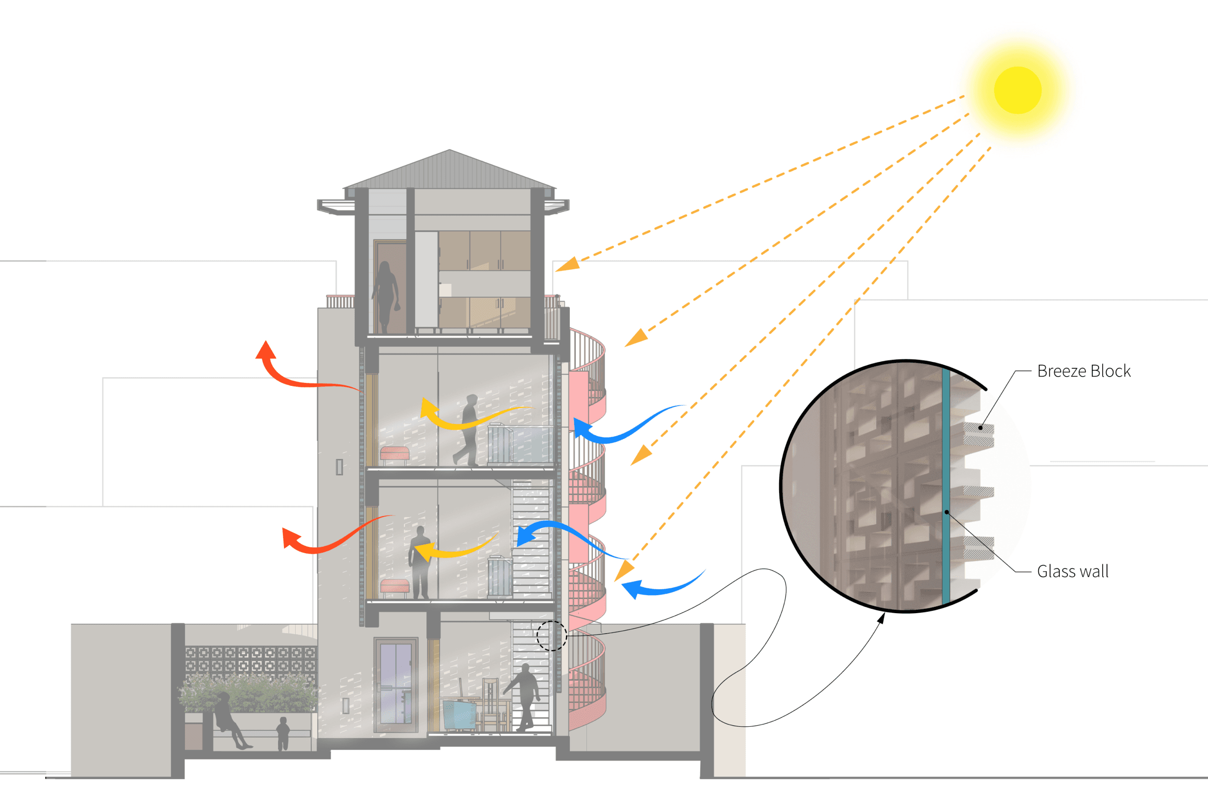 Glass walls with openable panes take advantage of natural lighting and natural ventilation, maximizing daylight and airflow. Coupled with breeze blocks, we significantly reduced solar heat gain. Thus, we were able to achieve a more sustainable building.